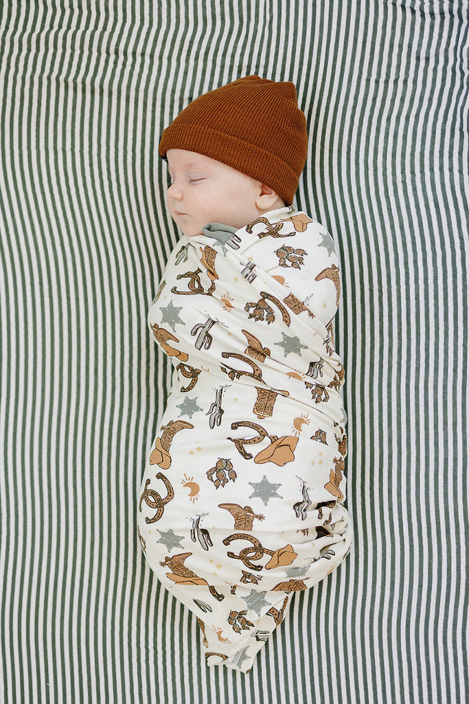 outlaw cowboy ribbed bamboo stretch swaddle is backordered and will ship as soon as it is back in stock.